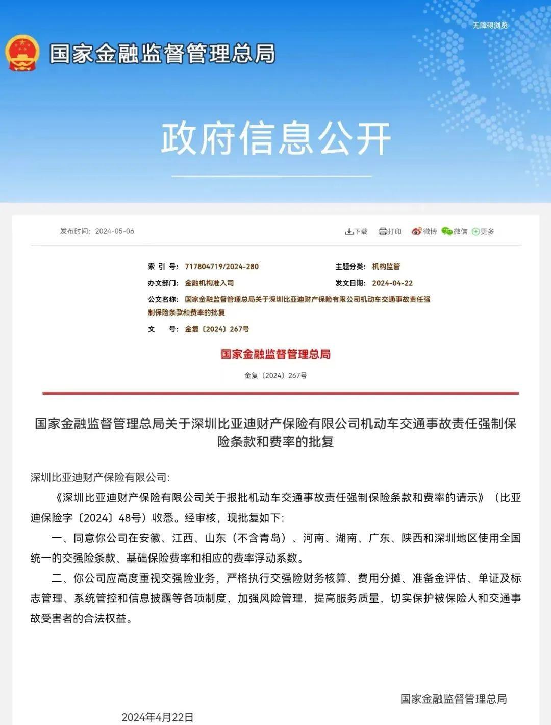 实际上,早在今年4月,国家金融监督管理总局曾发布批复称,同意比亚迪财险在安徽、江西、山东(不含青岛)、河南、湖南、广东、陕西和深圳地区使用全国统一的交强险条款、基础保险费率和相应的费率浮动系数。