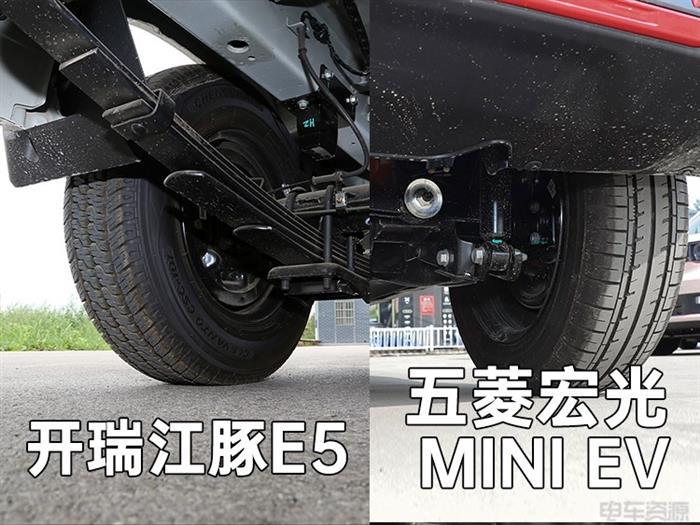 说到代步车型,不得不提的当然还有行车舒适性,由于电车动力都大差不差的,所以这点主要还是反馈在底盘上面,宏光MINI EV为前麦弗逊,后多连杆的悬挂,而江豚E5同样由于定位为轻型商用车,是要具备一定拉货需求的,所以采用前麦弗逊,后板簧的非独立悬挂,在行车舒适性上面多连杆确实比板簧会好一点,不过板簧对比多连杆的话,整体耐用程度更高以及维护也更方便,所以要耐用还是更舒适,这就是两个维度的选择了。